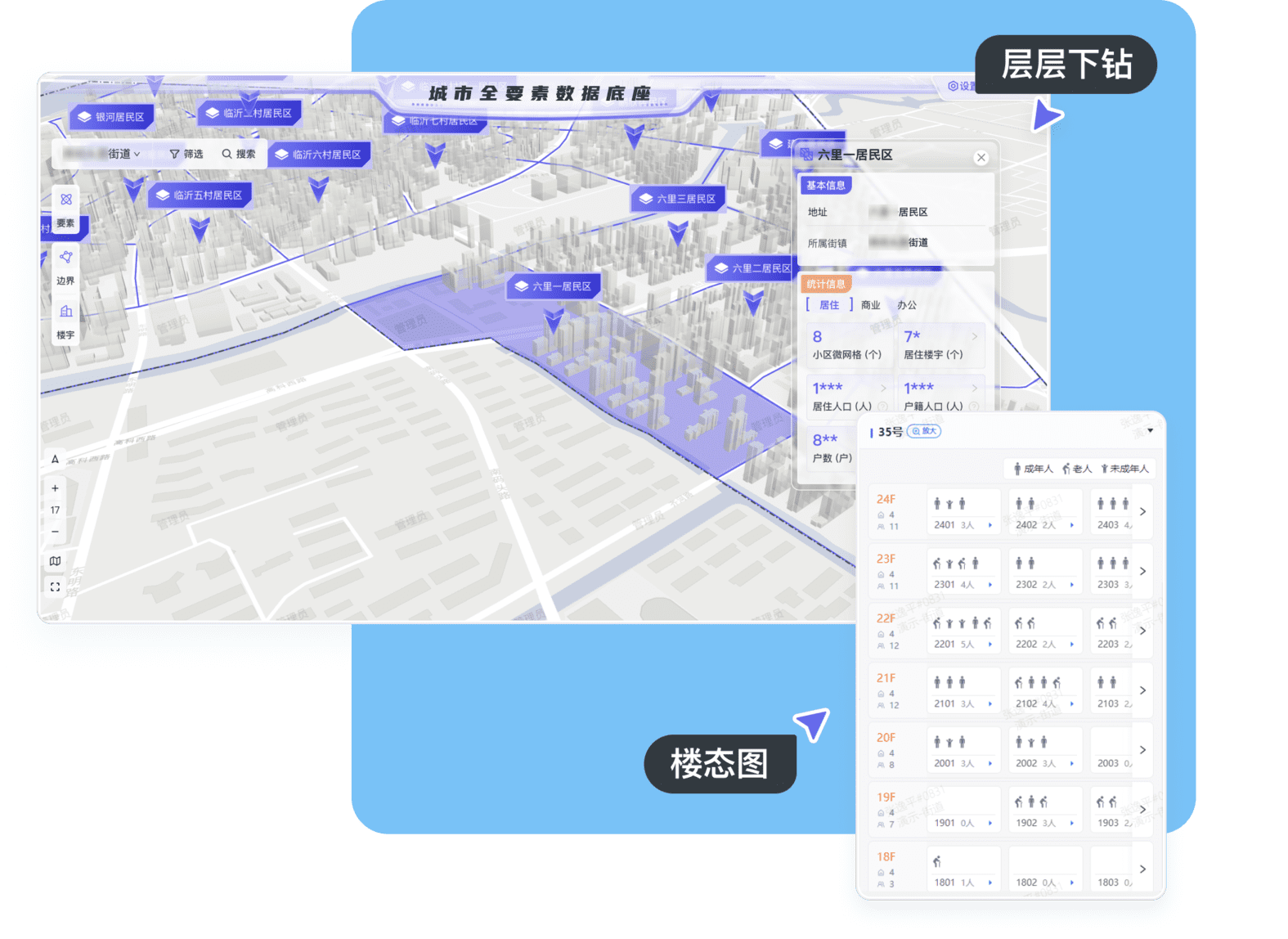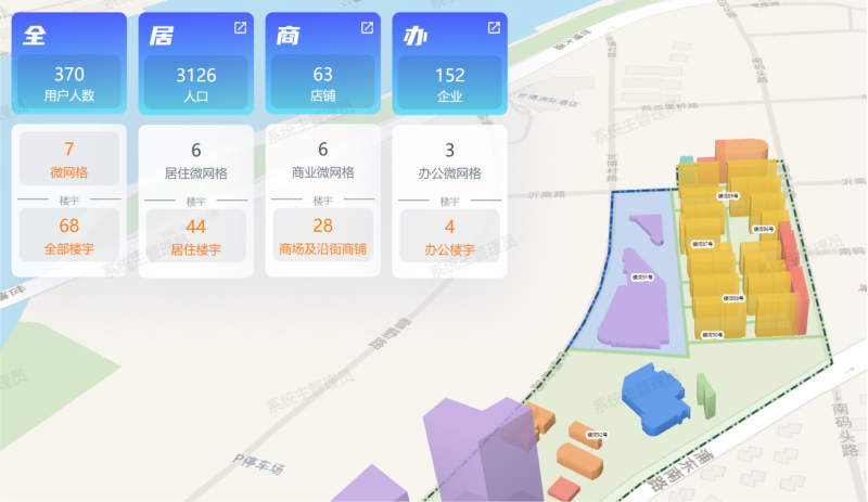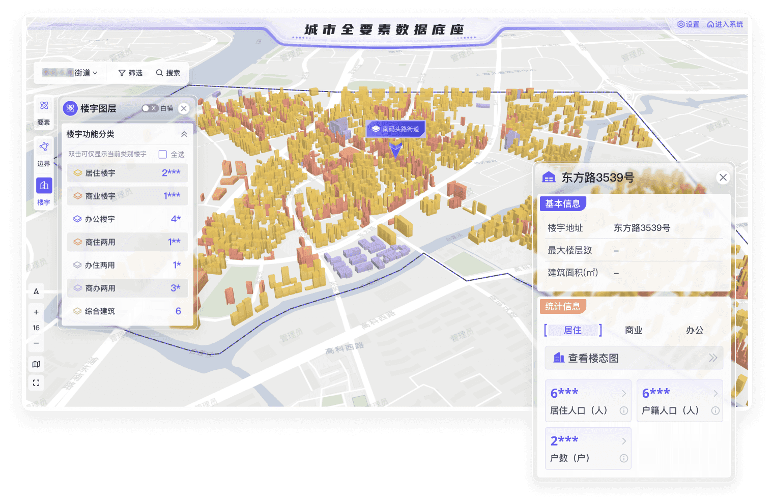 南码头路街道数字孪生底座汇聚辖区人口、房屋、居委、微网格、企业、商办楼宇、沿街商铺等数据,形成基层治理 “要素一张图”,形成辖区要素的一体化动态管理基础。基于各级各条线的服务工作记录,建立丰富的管理标签管理体系,打造基于人员、房屋、商铺、企业各级标签应用,为基层提供更加便捷灵活的数字化管理工具。